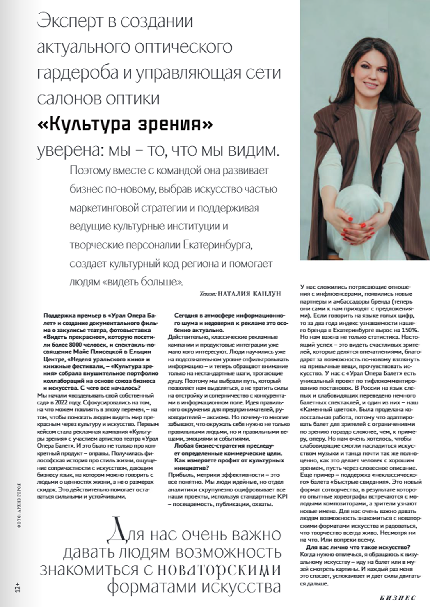 «Мы – то, что мы видим» – уверена эксперт в создании актуального оптического гардероба, управляющая сети салонов оптики «Культура зрения» Александра Копылова, поэтому вместе с командой развивает бизнес по-новому, выбрав искусство частью маркетинговой стратегии и поддерживая ведущие культурные институции и творческие персоналии Екатеринбурга, создает культурный код региона и помогает людям «видеть больше».